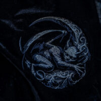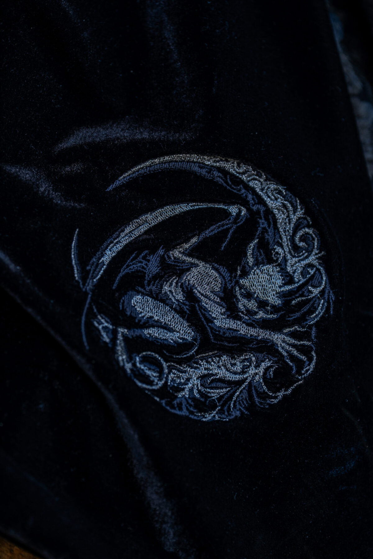 Materiais e acabamentos privilegiam textura e contraste: veludo denso, renda em alto relevo, brilho metálico discreto nos detalhes prateados. A peça apresenta presença serena e precisa, alinhada à natureza lunar de Selenyth.
