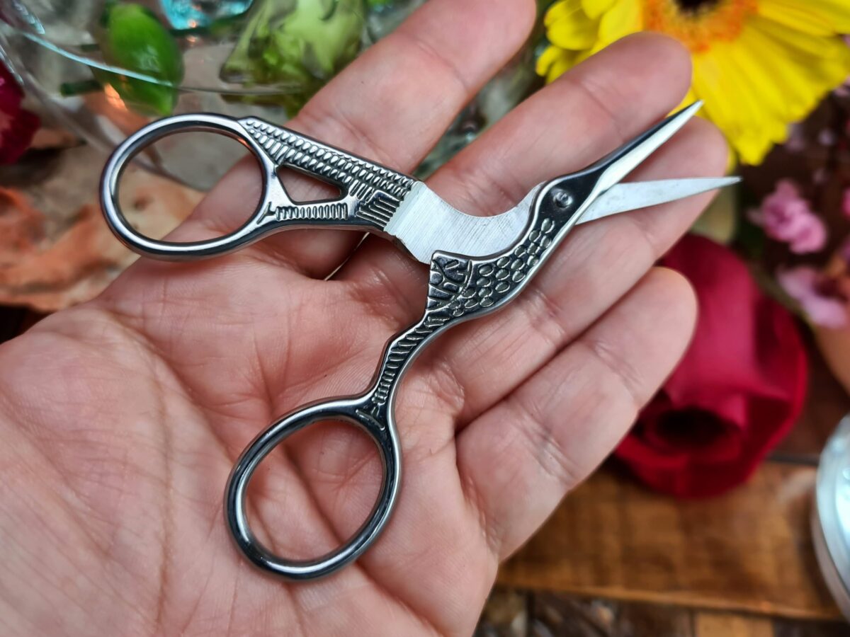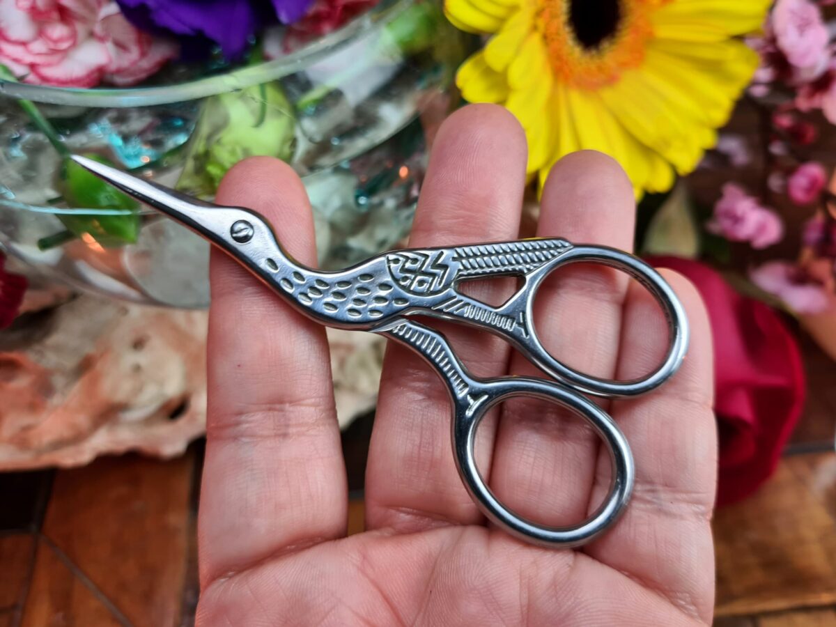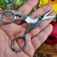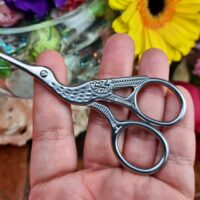 Tesoura de Costura Modelo Cegonha Retrô na cor prata. Ideal para pequenas costuras de Poppets e Mojos, onde sua ponta mais fina e reta facilita a correção e pequenos cortes.