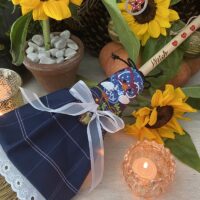 Vassoura de fibra natural, feita totalmente de modo artesanal, com capa em tecido bodado, com laços e outros adereços. A capa da vassoura é lavável e facilmente removível.