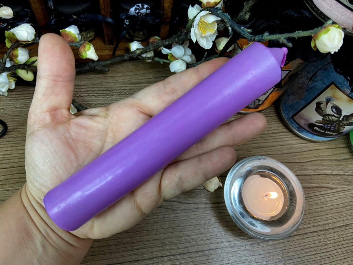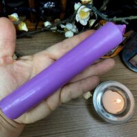 Vela de transmutação Lilás. As velas de transmutação são brancas por dentro e banhadas com parafina colorida por fora. Dessa forma ela ativa a correspondência das cores, utilizando o branco de base.