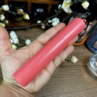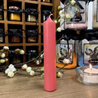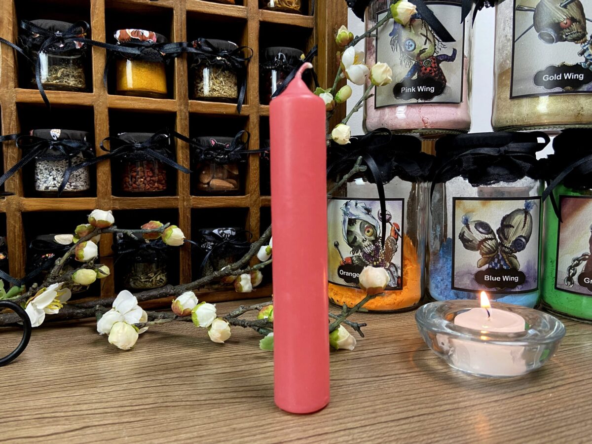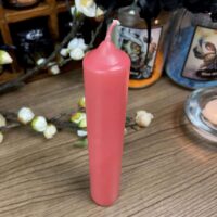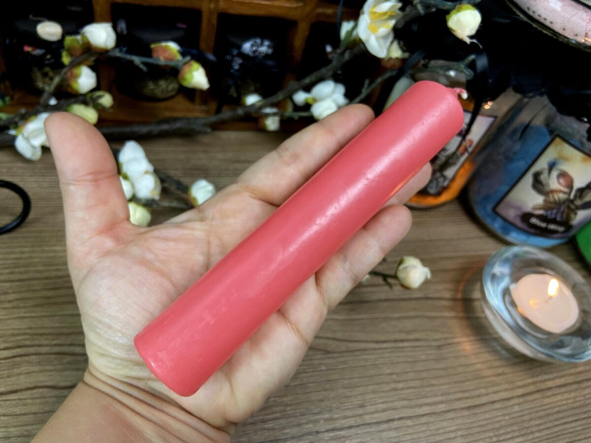 Vela de transmutação Rosa. As velas de transmutação são brancas por dentro e banhadas com parafina colorida por fora. Dessa forma ela ativa a correspondência das cores, utilizando o branco de base.