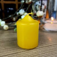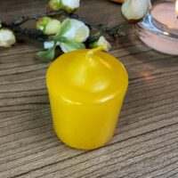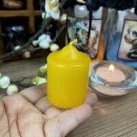 Vela de transmutação Amarela. As velas de transmutação são brancas por dentro e banhadas com parafina colorida por fora. Dessa forma ela ativa a correspondência das cores, utilizando o branco de base.