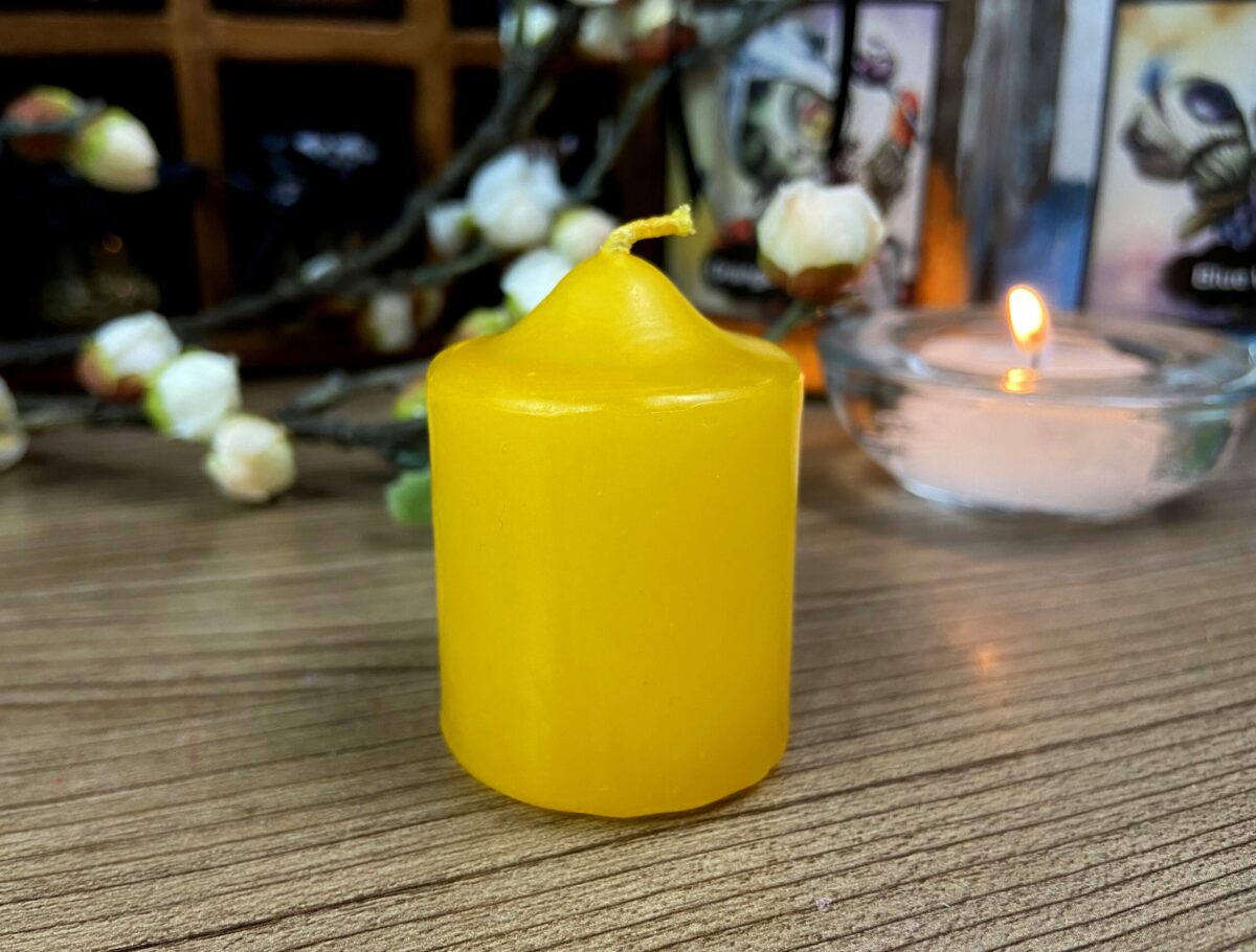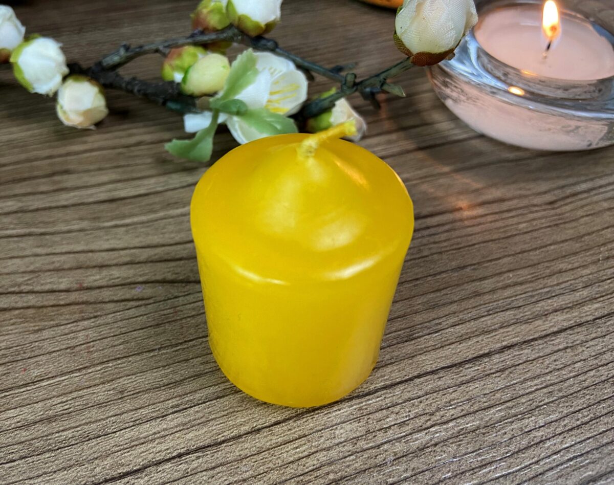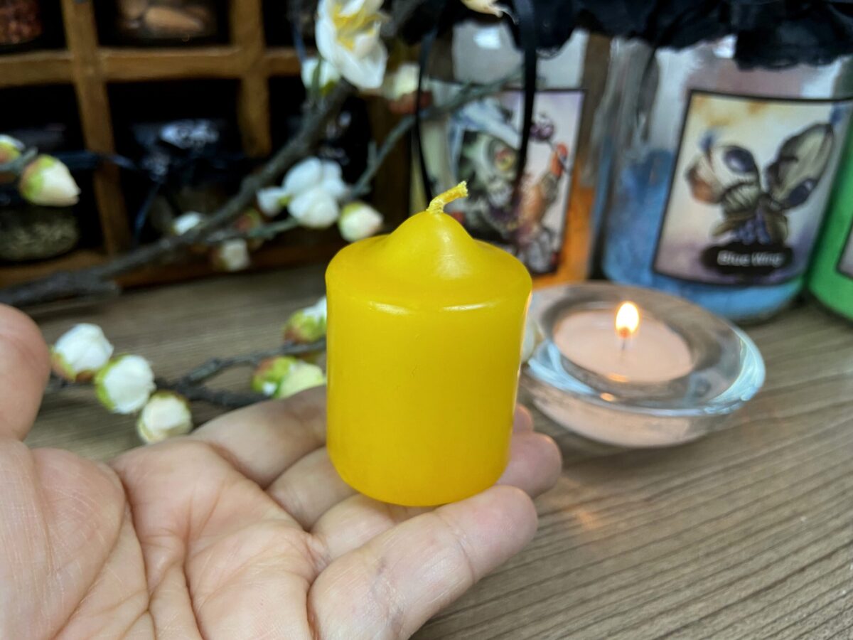 Vela de transmutação Amarela. As velas de transmutação são brancas por dentro e banhadas com parafina colorida por fora. Dessa forma ela ativa a correspondência das cores, utilizando o branco de base.