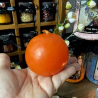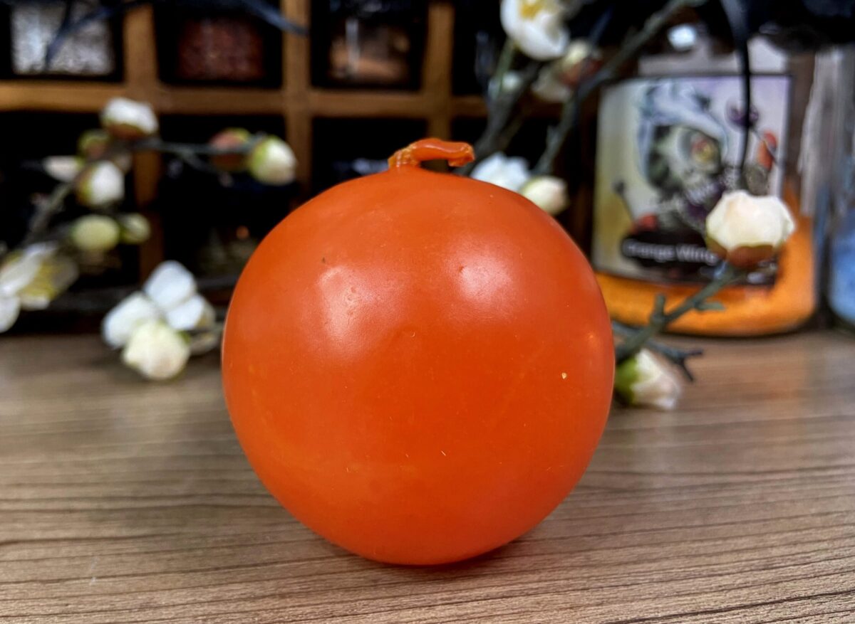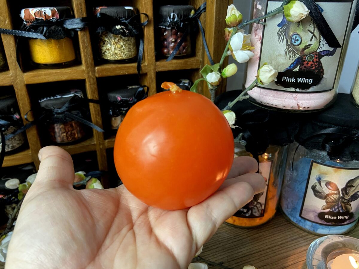 Vela de transmutação Laranja. As velas de transmutação são brancas por dentro e banhadas com parafina colorida por fora. Dessa forma ela ativa a correspondência das cores, utilizando o branco de base.