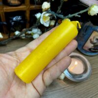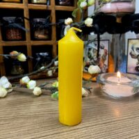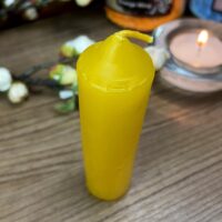 Vela de transmutação Amarela. As velas de transmutação são brancas por dentro e banhadas com parafina colorida por fora. Dessa forma ela ativa a correspondência das cores, utilizando o branco de base.
