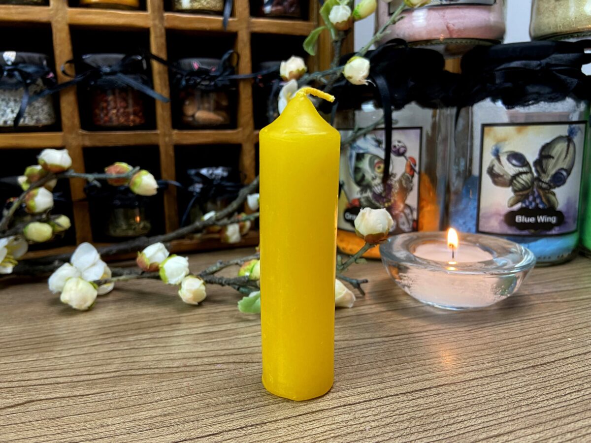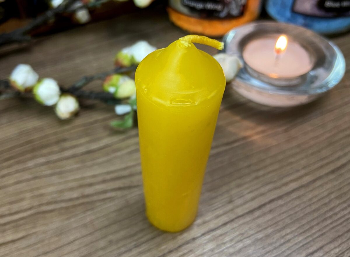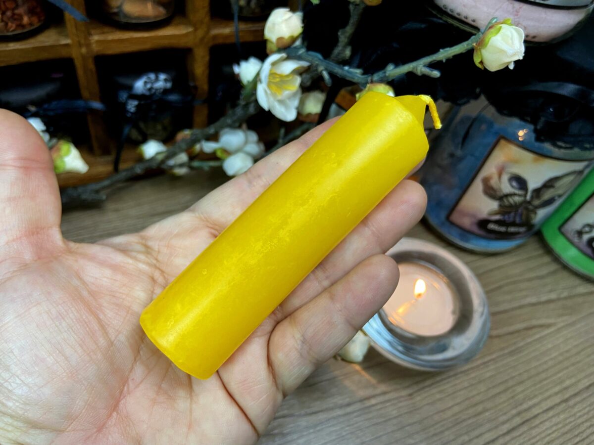 Vela de transmutação Amarela. As velas de transmutação são brancas por dentro e banhadas com parafina colorida por fora. Dessa forma ela ativa a correspondência das cores, utilizando o branco de base.