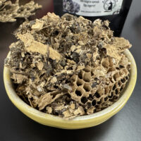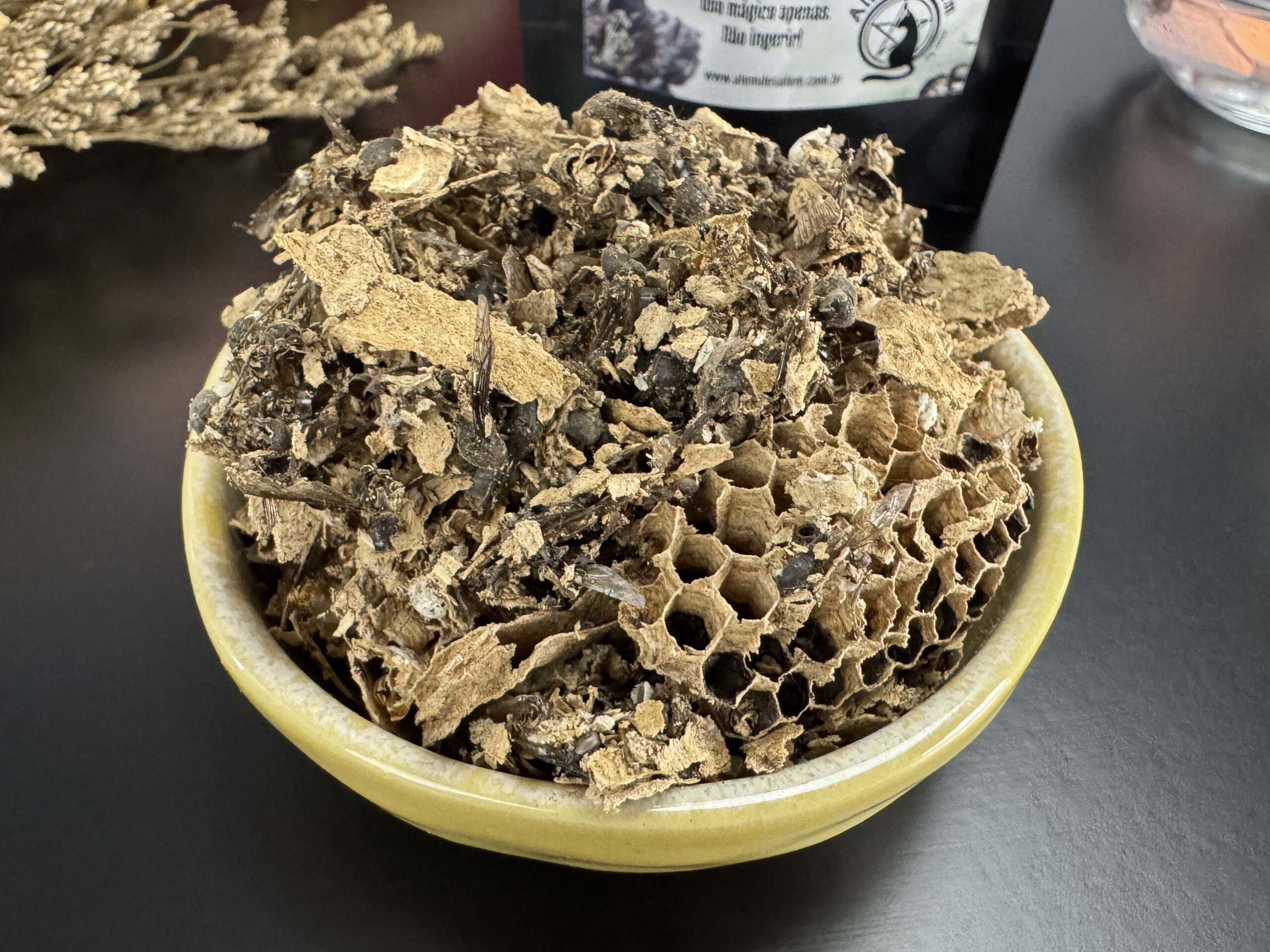 Conjunto composto por ninho natural acompanhado de vespas desidratadas.